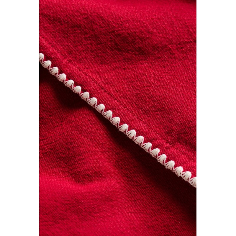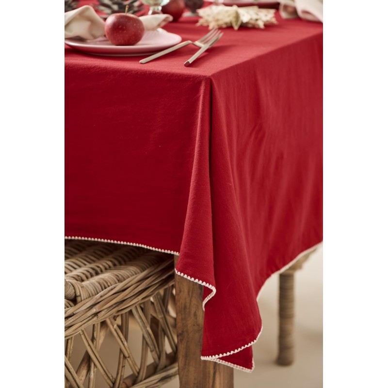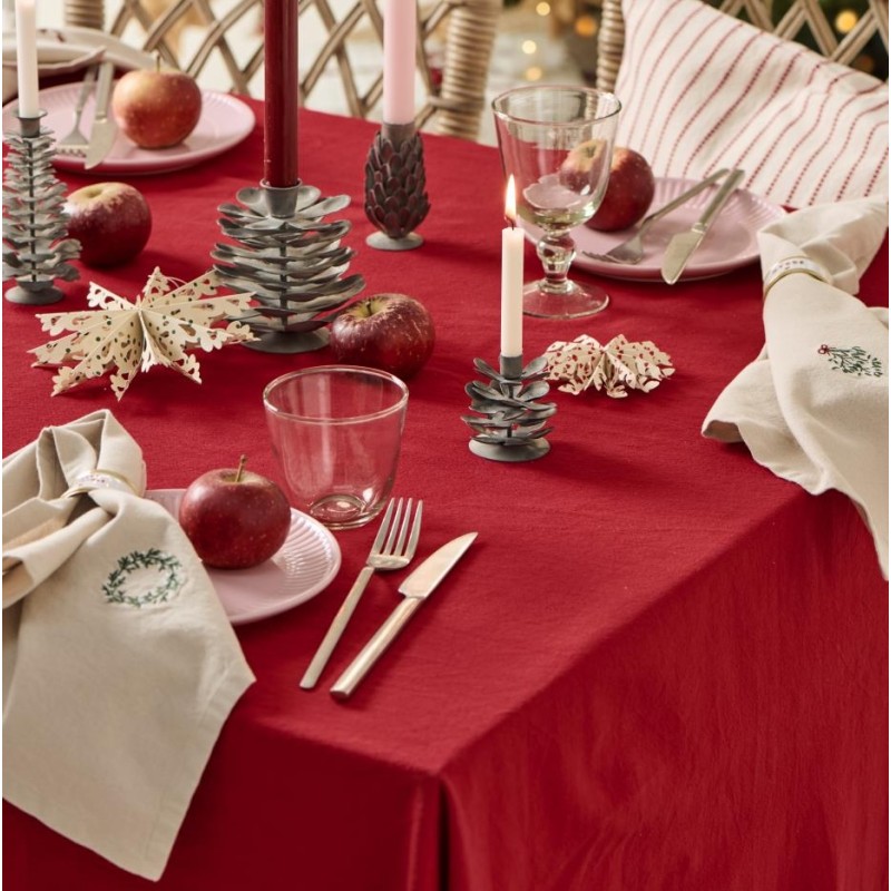 Skab hygge og varme med duggen Dagmar fra Ib Laursen. Måler 150x250 cm, klassisk rød med fine hvide stikninger langs kanterne. Perfekt til julens fester, hyggelige vintermiddage eller som stilfuldt nordisk udtryk ved middagsbordet året rundt.