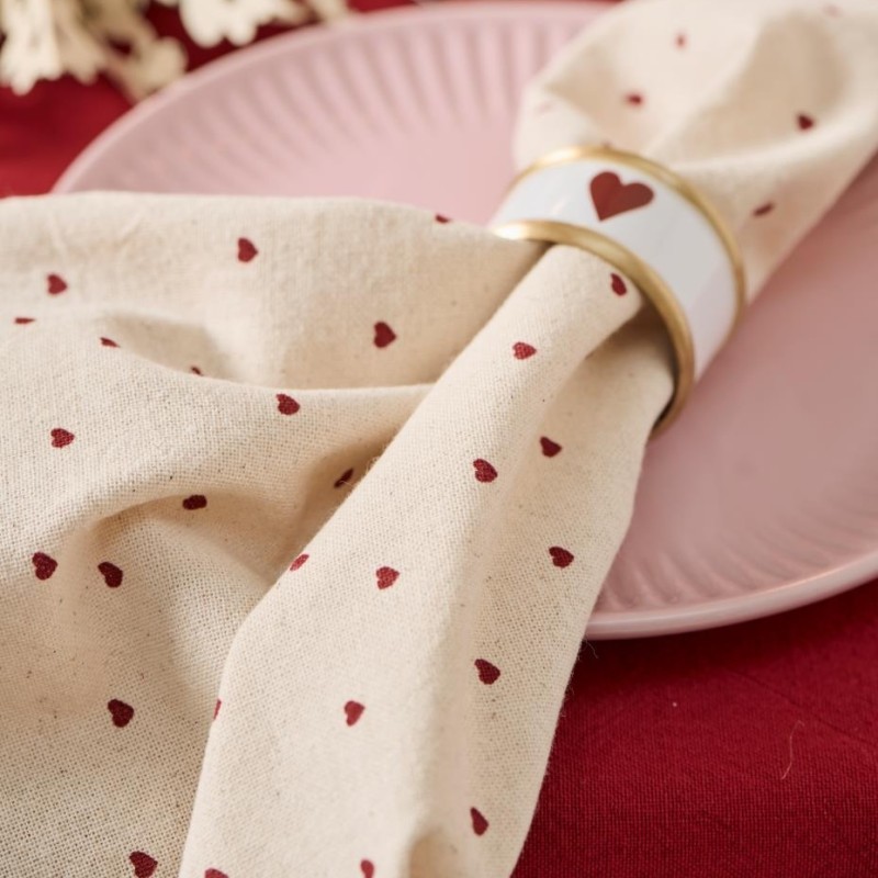 Skab romantik og hygge med stofservietten "Valentin" fra Ib Laursen. Den sandfarvede serviet er dekoreret med små røde hjerter, som giver borddækningen et varmt og personligt præg. Perfekt til Valentinsdag, en middag for to eller julebordet. Fremstillet i blødt, genanvendeligt stof til brug år efter år.